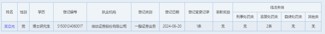 现任总裁祝瑞敏女士,在信达证券IPO期间因分管投行业务和境外业务,两次收到监管处罚。合规负责人吴立光,曾被采取监管谈话的监管措施。如今,这两位高管名下各有两则“违法失信”记录,尚未“消除”。