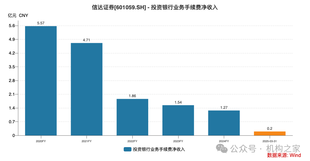 这一背景赋予了信达证券经营上的双面性:一方面,得益于中国信达的业务协同,公司在不良资产证券化、债务重组融资等固定收益领域拥有独特优势和稳定项目来源。例如,其年报显示公司承做过多个行业首单的固定收益产品。但另一方面,AMC的业务衍生很少涉及股权融资,几乎不给公司带来IPO等权益类项目。数据显示,信达证券投资银行业务手续费净收入自2020年的5.57亿元连续4年下滑至2024年的1.27亿元,减少近80%。从承销情况来看,数据显示,近三年不仅股权承销未恢复至高点,债权承销金额亦由2021年的1381.74亿元骤降至2022年的453.24亿元之后,未见明显起色。