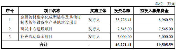 奥美森拟募资19,505.59万元,用于金属管材数字化成型装备及其他订制类智能设备生产基地建设项目、研发中心建设项目和补充流动资金项目。