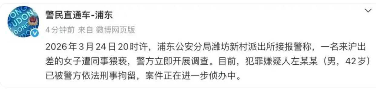 据@警民直通车-浦东,2026年3月24日20时许,浦东公安分局潍坊新村派出所接报警称,一名来沪出差的女子遭同事猥亵,警方立即开展调查。目前,犯罪嫌疑人左某某(男,42岁)已被警方依法刑事拘留,案件正在进一步侦办中。