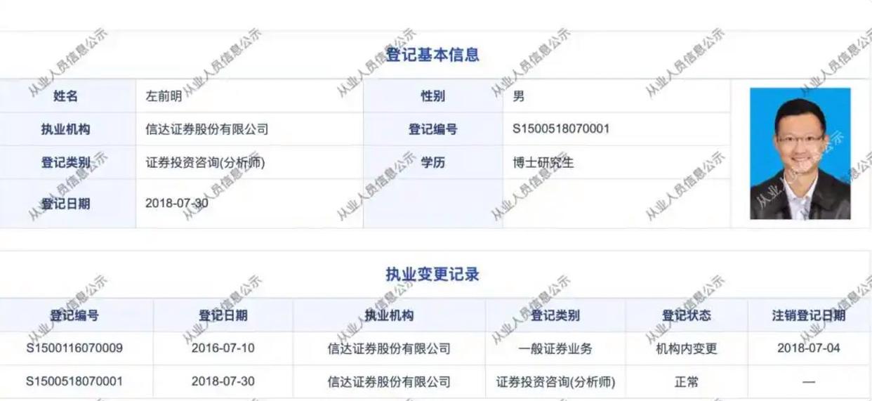 中证协官网资料显示,左前明的执业登记机构登记为信达证券,登记类别为一般证券业务。2018年7月30日,左前明在信达证券的登记类别变更为证券投资咨询(分析师)。截至3月25日,左前明在信达证券的登记状态仍显示正常。