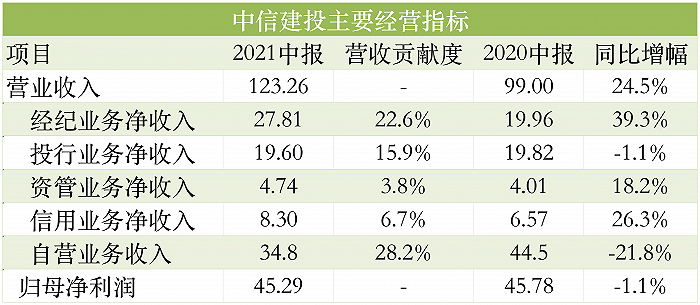 8月26日晚间,中信建投发布2021年半年报,报告期内公司实现营业收入123.26亿元,同比增长24.5%,归母净利润为45.29亿元,较去年同期下滑1.1%。