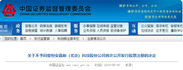 2019年,恒安嘉新(北京)科技股份公司因存在会计基础工作薄弱、内控缺失、信息披露不完整等问题,证监会对公司发行股票并上市的申请作出不予注册决定。