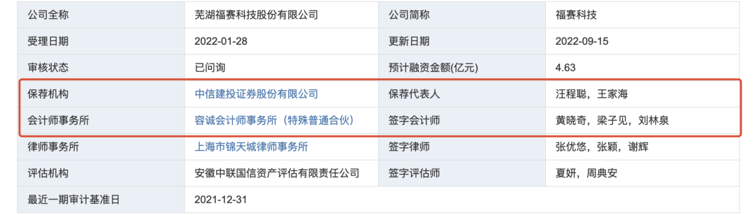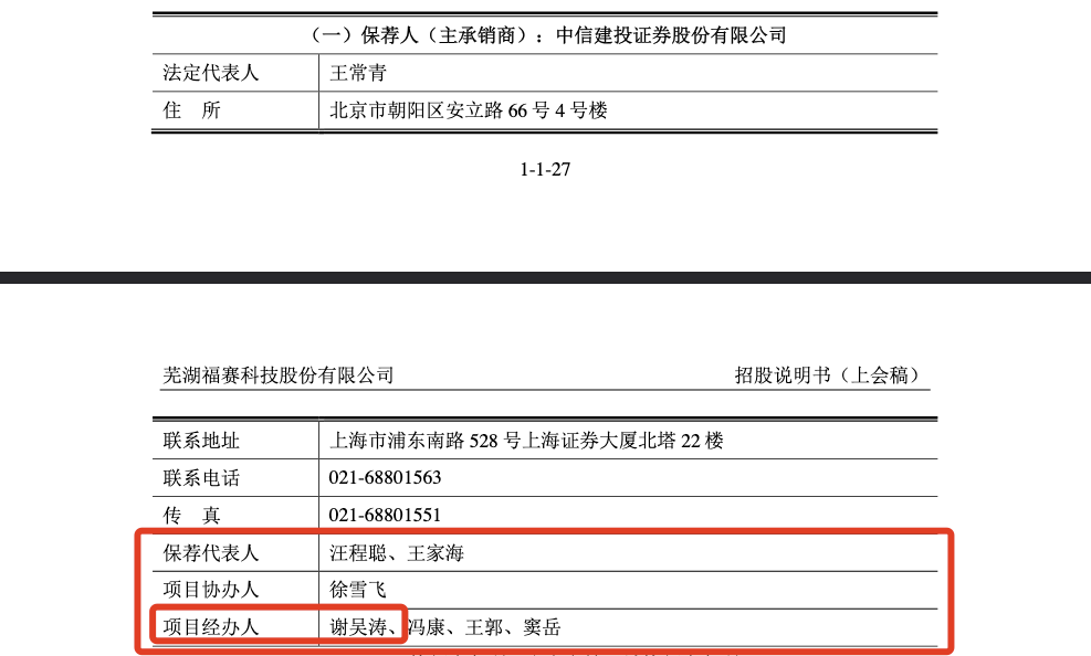 福赛科技保荐机构为中信建投证券股份有限公司(以下简称“中信建投证券”)保荐代表人汪程聪,王家海。项目协办人?徐雪飞,项目经办人谢吴涛、冯康、王郭、窦岳。会计师事务所容诚会计师事务所(特殊普通合伙)签字会计师黄晓奇,梁子见,刘林泉。