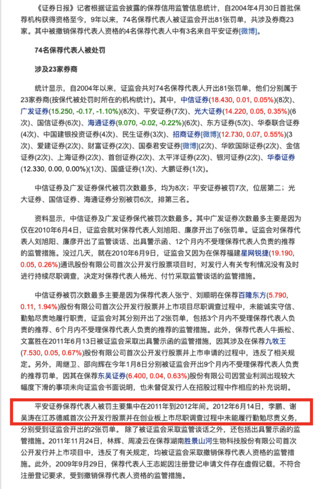 具体来看,2012年6月平安证券保代李鹏、谢吴涛在江苏德威首发并在创业板上市尽职调查过程中未能履行勤勉尽责义务,受到出具警示函的监管措施;”