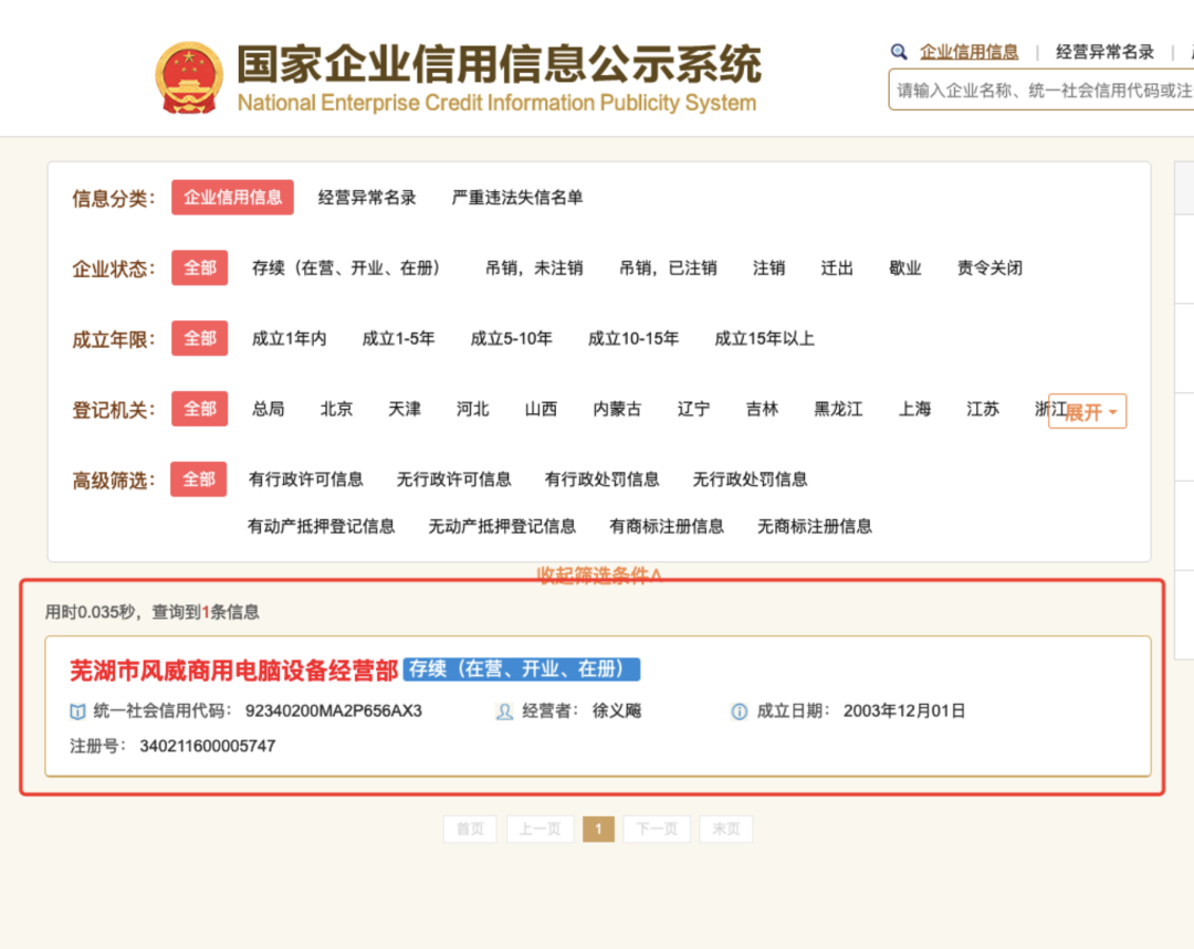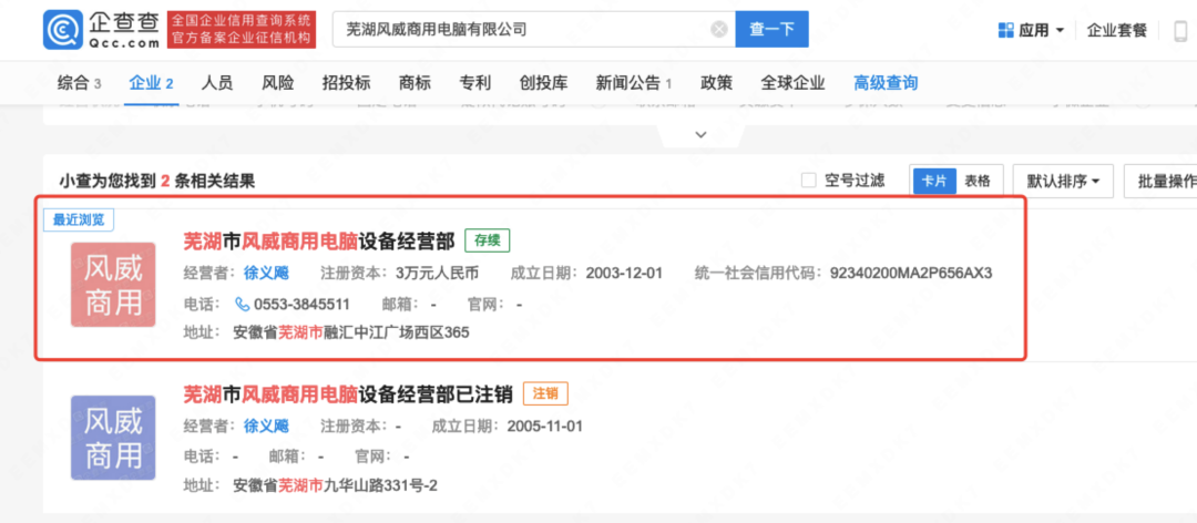 通过中信建投证券保荐代表人汪程聪,王家海撰写福赛科技招股书显示的,“芜湖风威商用电脑有限公司”通过“国家企业信用信息公示系统”查询“芜湖风威商用电脑有限公司”结果显示“查询到0”条信息。
