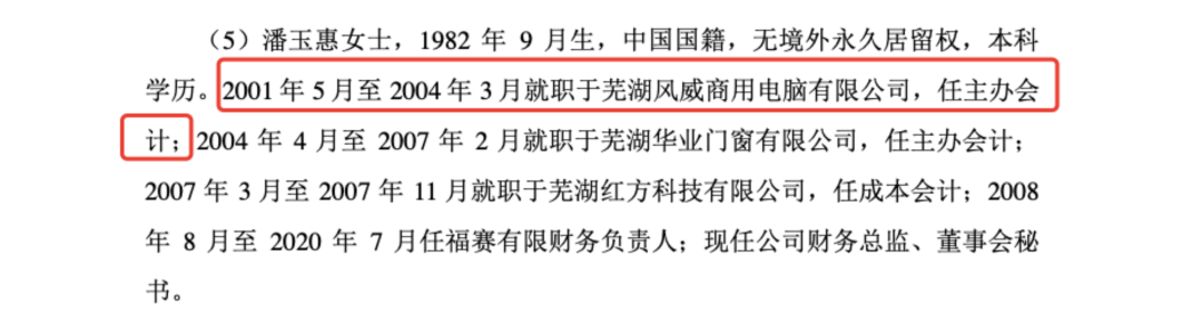 福赛科技招股书(上会稿)显示,潘玉惠女士,1982 年 9 月生,中国国籍,无境外永久居留权,本科学历。2001 年 5 月至 2004 年 3 月就职于芜湖风威商用电脑有限公司,任主办会计;2004 年 4 月至 2007 年 2 月就职于芜湖华业门窗有限公司,任主办会计;2007 年 3 月至 2007 年 11 月就职于芜湖红方科技有限公司,任成本会计;2008年 8 月至 2020 年 7 月任福赛有限财务负责人;现任公司财务总监、董事会秘书。