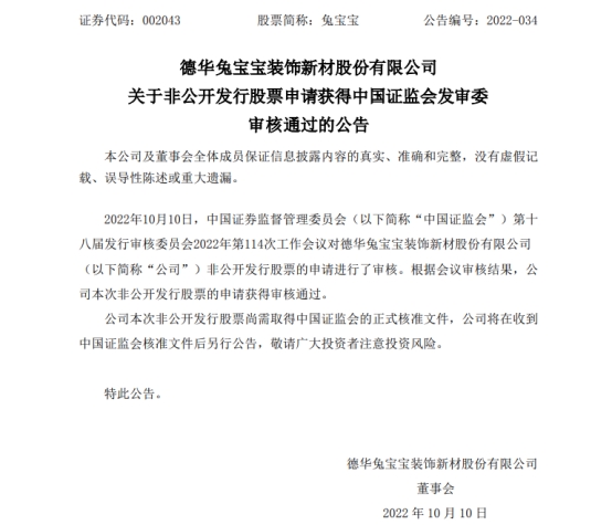 中国经济网北京10月11日讯兔宝宝(002043.SZ)昨晚公告称,10月10日,中国证监会第十八届发行审核委员会2022年第114次工作会议对公司非公开发行股票的申请进行了审核。根据会议审核结果,公司本次非公开发行股票的申请获得审核通过。公司本次非公开发行股票尚需取得中国证监会的正式核准文件,公司将在收到中国证监会核准文件后另行公告。