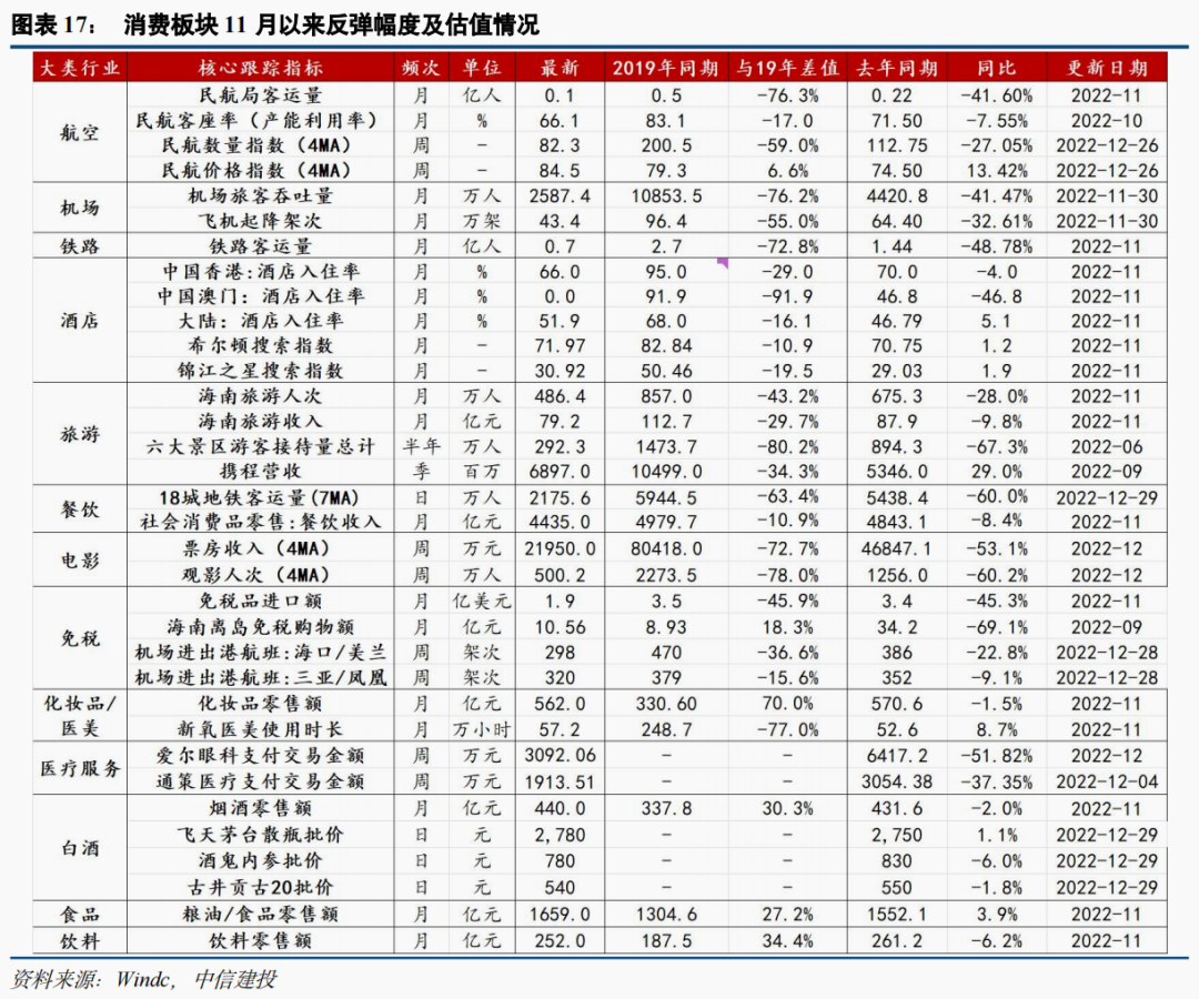 政策及预期驱动下,A股消费板块估值先行,相关申万二级行业指数11月以来股价及估值普遍反弹15%以上,目前多数板块估值高于19年同期、处于5年估值40%以上。随着估值率先修复而基本面验证短期仍具不确定性,第一轮预期驱动下的超额收益快速上行行情或将步入尾声,板块逐步转向基本面驱动交易。从目前高频指标恢复情况看,近期表现相对较佳的板块包括食品(C端受益疫情囤货需求,B端受益餐饮修复预期提振)、免税(海南旅游旺季到来,三亚航班同比降幅迅速收窄)、医美(新氧使用时长明显提升)。