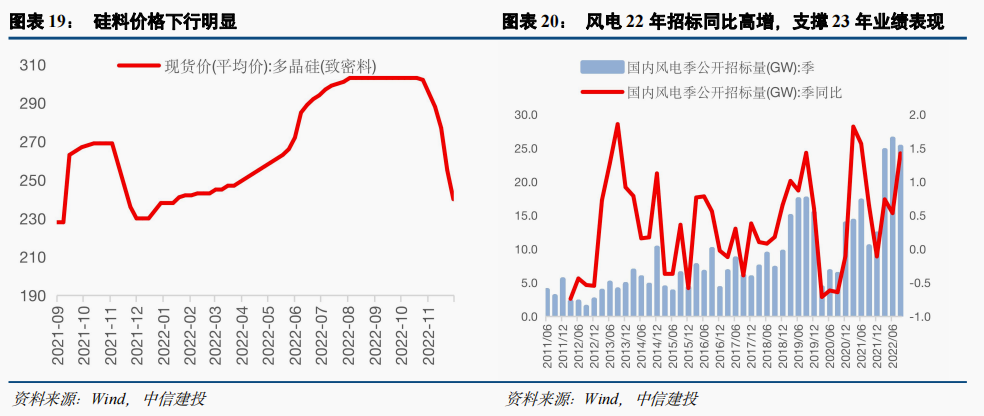而另一方面,估值及交易热度渐回落至低位,而一季度存较多利好预期的科技成长板块则可逐步关注配置。当前整体经济环境偏低迷,12月制造业PMI处于三年以来低位水平,在经济基本面受疫情冲击,而尚未有有力新政策出台前,年度业绩预告超预期及低位利空出尽的高需求品种值得关注。近一个月以来,高端制造及TMT板块相对收益明显跑输,目前主要申万二级板块五日成交额占比及换手率(5MA)的五年分位数已回落普遍回落至65%以下合理分位,从估值水平看,光伏(含储能逆变器)/航空装备/风电/半导体PE(TTM)五年分位分别已达10%、36%、52%、3%的低位水平,而以产业周期视角看,光伏中下游、海风、储能、军工导弹链等仍处于需求稳定向上周期,未来两年需求复合增速有望维持30%+;半导体则有望在23年实现盈利周期反转。中期高景气需求支撑下,疫情、政策等部分因素仅改变短期盈利节奏,并不改中期向好预期,随下跌逐步反应如新能源装机不及预期担忧、军工交付担忧及美国对华制裁政策风险等,一季度相关风险点均有望得到实际性解决及改善,且在经济预期低迷环境下仍将凸显景气稀缺性,行情反弹可期。
