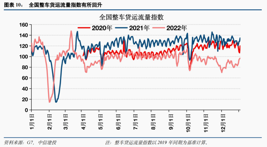 3)整车货运在11月下旬受到冲击,12月处于低位,近期物流指数开始回升。近期整车货运流量指数呈现震荡上升的态势,物流水平不断恢复,已基本恢复至11月下旬受到冲击前的水平。