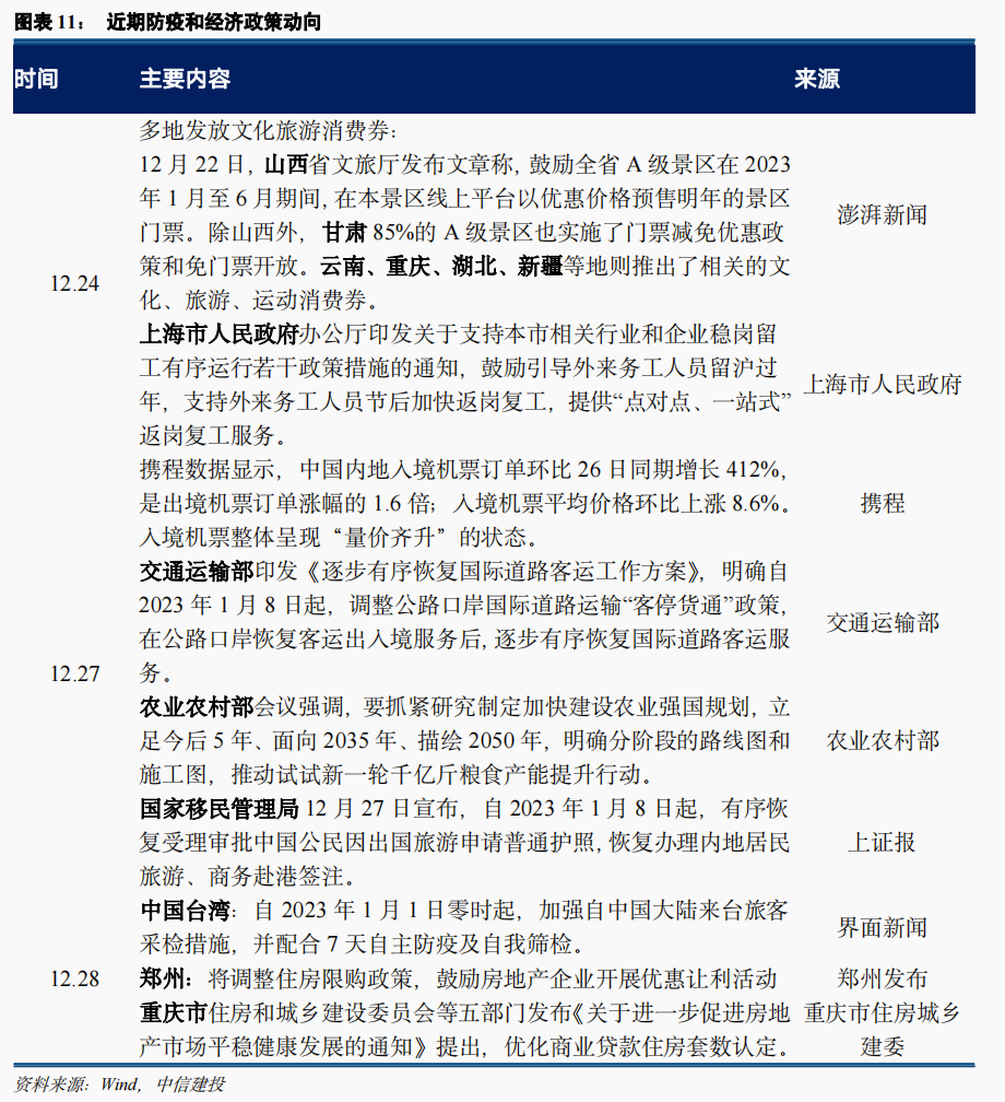 1)基本面修复弹性:近期部分一线城市第一批感染者已经陆续痊愈,各地出行数据已经有复苏迹象,同时受到元旦节日影响,线下出行和消费数据得到了改善,本轮阳达峰影响不确定性最大的阶段已经过去,经济活动反弹幅度成为焦点。