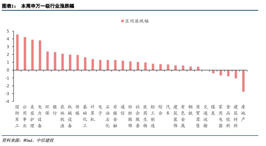 本周市场有所上涨但情绪仍然偏弱,市场热点持续性差。上证指数本周上涨1.42%,深证成指上涨1.53%,创业板上涨2.65%,是市场二次探底后的回升行情延续。行业层面,本周大多数行业板块普遍上涨,其中国防军工、公共事业、美容护理涨幅居前,分别上涨4.55%、4.22%和3.88%;电力设备、计环保、银行、农林牧渔涨幅其次,分别上涨3.80%、2.38%、2.30%和2.09%;机械设备、传媒、基础化工涨幅较小,分别上涨1.98%、1.93%和1.65%,而房地产板块跌幅最大达到2.76%。市场风格维度,上周国证价值下跌3.68%,国证成长下跌3.96%,本周出现反转:国证价值上涨0.77%,国证成长上涨1.86%,风格整体上处于价值向成长过渡;中证1000上涨1.96%,中证100上涨0.78%,中小盘走势占优。