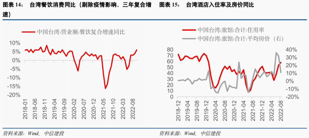 12月“新十条”防疫政策放松以来,随各地管控放松及消费场景复苏,消费板块迎来中期基本面拐点。参考相关亚洲经济体放开后消费板块股价表现,可分为三阶段:政策驱动、疫情冲击、基本面驱动。以中国台湾为例,22年2月起消费指数(食品/旅游/百货/运输)及医药开始跑赢台湾加权指数,4月政策开始采取放松导向,在疫情反扑对基本面造成冲击背景下,5-6月消费再度跑输。6月起确诊逐步下行、公共场所人员流动性恢复,消费整体复苏但弹性有限、结构分化。餐饮消费恢复较佳,以三年复合增速看(剔除同期基数异常影响),目前已恢复至疫前正常水平;零售消费维持震荡,填坑后8月起拐头下行;服务出行方面,酒店入住率自6月起修复,截至8月已超过20-21年最高水平,较疫情前仅有10pct的差距。对应到股市表现上,百货因零售消费恢复疲弱自8月开始率先跑输大盘,而食品、旅游指数跑赢趋势持续至10月,从弹性来看旅游表现最佳。