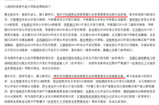 中信建投证券指派的两位保荐代表人,是负责生泰尔上市辅导工作的隋玉瑶、潘可,这两位都有丰富的经验。