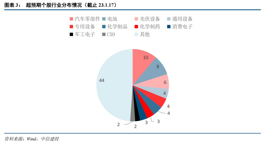 结合自下而上验证,以业绩预告披露中值是否超过Wind一致预期与否评判超预期/低预期,截止1月17日超预期个股主要集中在前述方向,以汽车零部件、电池、光伏、新冠药产业链居多。