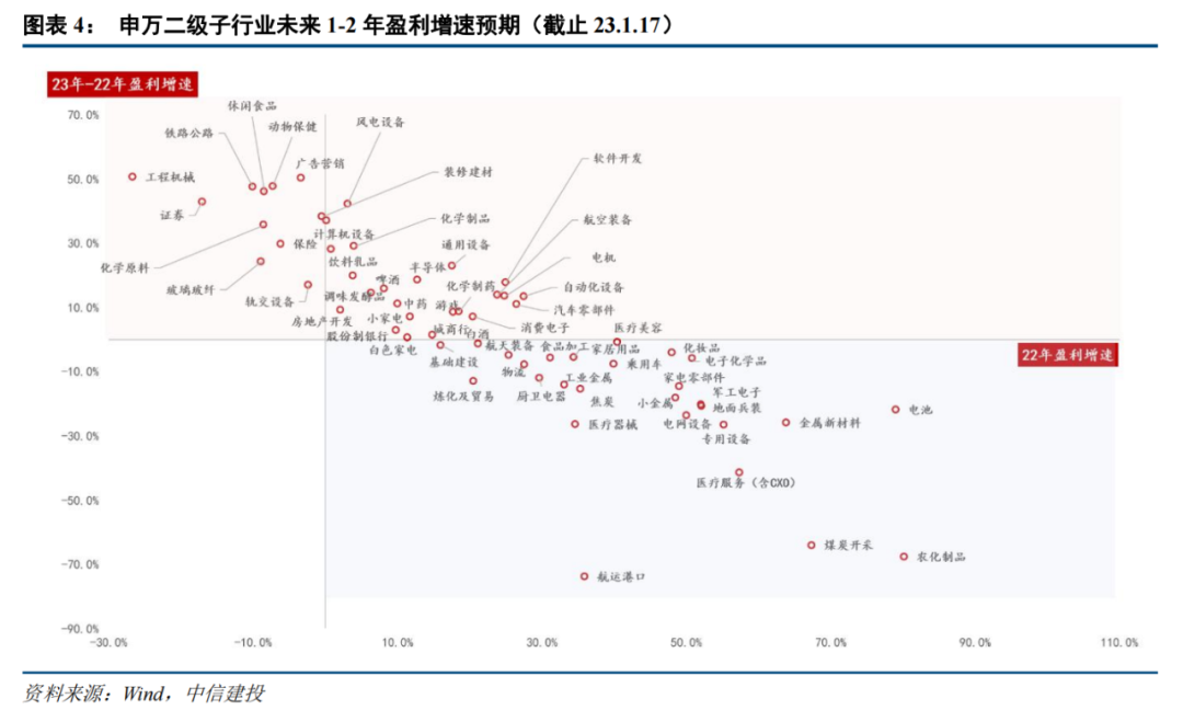 4)23年中低景气(23年预期利润增速 30%且环比22年下行):资源品(化肥/油气/煤炭/航运/油运/稀土)、光伏链(硅料硅片)、基建、医药(CXO/新冠检测)、高端装备(能源设备)、通信(光纤/运营商/光模块)