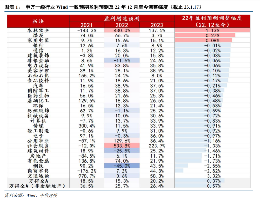 截止1月18日,逾400家公司已披露22年业绩预告,整体披露率达8%,披露率较高的行业主要为家电(15.2%)、电子(11.8%)及电力设备及新能源(11.3%)。结合业绩预告及四季度宏中观景气情况看,受疫情频发扰动,9-10月“金九银十”旺季不旺,12月开工及日常消费受较严重冲击,预计四季度A股业绩恐将略低于市场预期。Wind盈利一致预期(自下而上汇总)显示,22年12月以来全A及全A(非金融地产) 22年盈利预测分别下调0.37pct、0.57pct;行业层面,农林牧渔、煤炭及家电为仅有的三个盈利预测上调的细分,而地产链(建材/地产开发/有色/钢铁)、出行链(社会服务/商贸零售)及交运则下调明显。