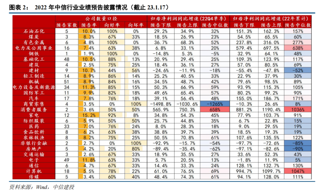 1) 22Q4业绩高增(核心标的普遍 30%)的细分板块可关注光储/新能源车(光伏及设备/储能及设备/电池中下游及锂电设备/新能源整车/一体化压铸)、新冠药产业链(零售药房/部分中药)、部分新材料(碳纤维/电子化学品/工业气体)、养殖链(畜禽养殖/饲料/动保)、光纤光缆、轮胎/钾肥、城商行;
