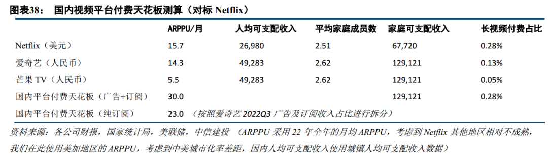 任何产品/服务的消费都不能逃脱用户在一定可支配收入下的支付意愿天花板,毕竟长视频仍然属于可选消费,对大多数用户来说,即使前期不明显,但对价格的敏感多多少少都是存在的。通过对比中美家庭长视频付费水平在家庭可支配收入中的占比,我们来测算国内视频平台用户的消费潜力——头部长视频平台ARPPU天花板有望达到23元/月,提价仍有空间。