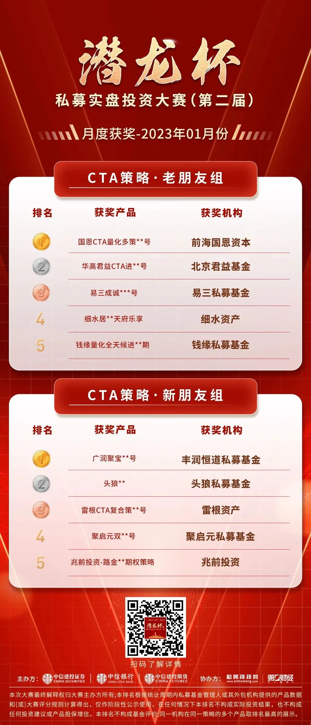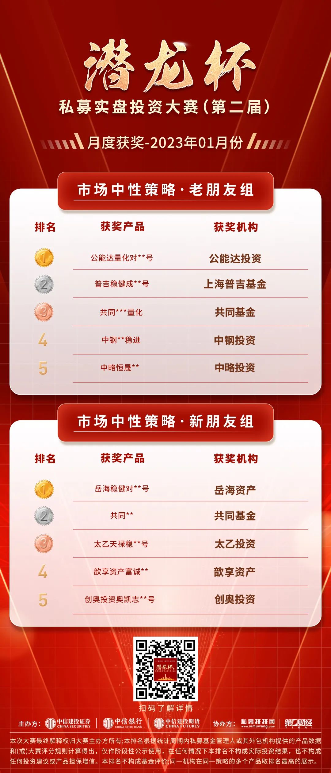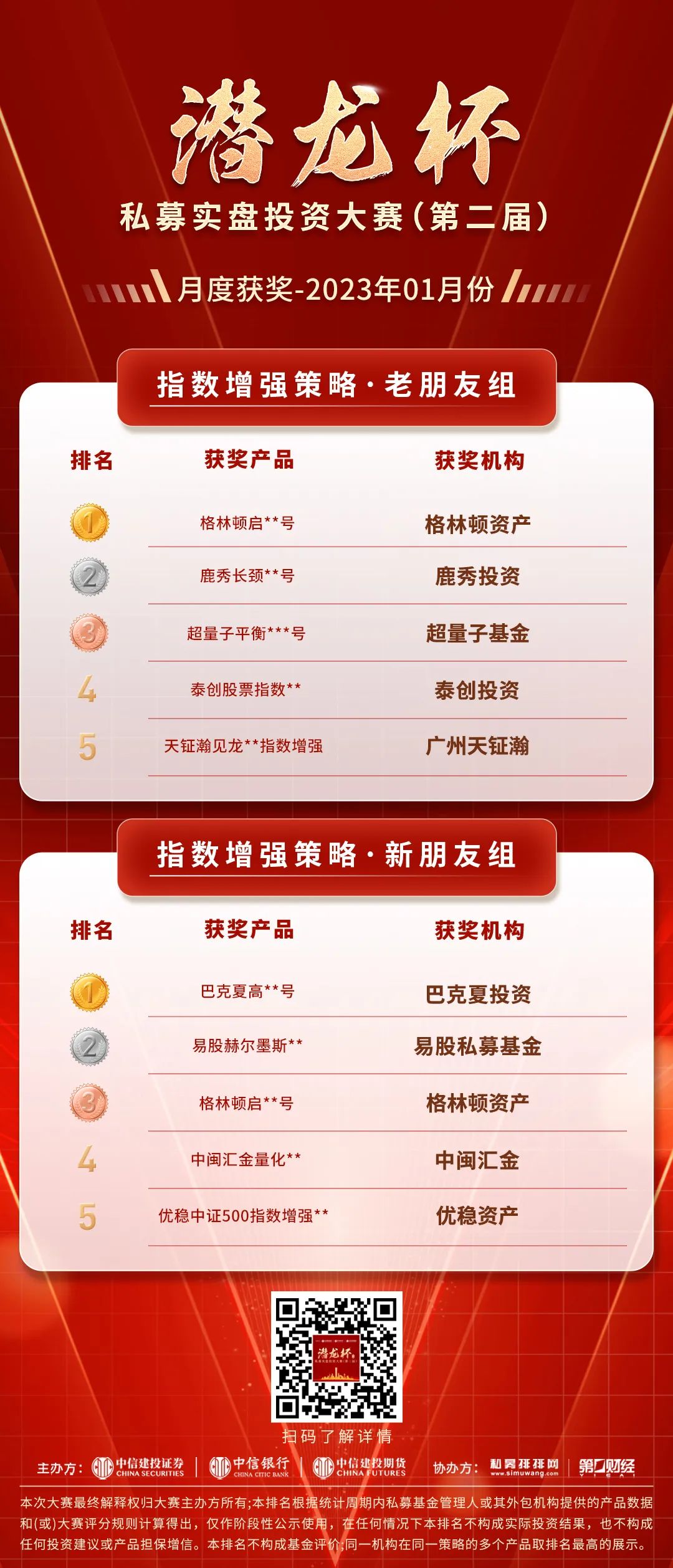 在一片向好的市场行情下,由中信建投证券携手中信银行、中信建投期货举办的第二届“潜龙杯”私募实盘投资大赛也上演了一出精彩较量,多家私募管理人凭借优异业绩脱颖而出并登上2023年1月榜单。