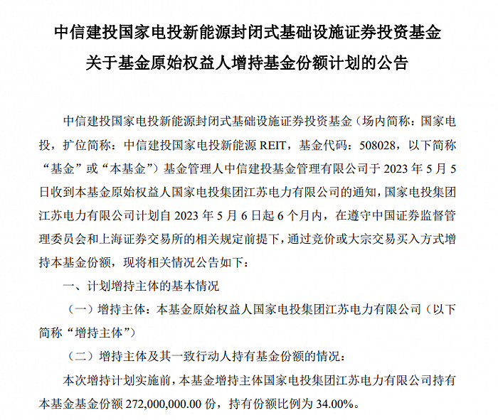 今日,中信建投国家电投新能源REIT发布公告,称原始权益人国家电投集团江苏电力有限公司计划自2023年5月6日起6个月内,在二级市场通过竞价或大宗交易买入方式增持该基金份额。