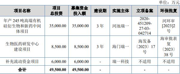 公司原拟募集资金49,500.00万元,计划用于年产245吨高端有机硅衍生物和新药中间体项目、生物医药研发中心建设项目、补充流动资金项目。