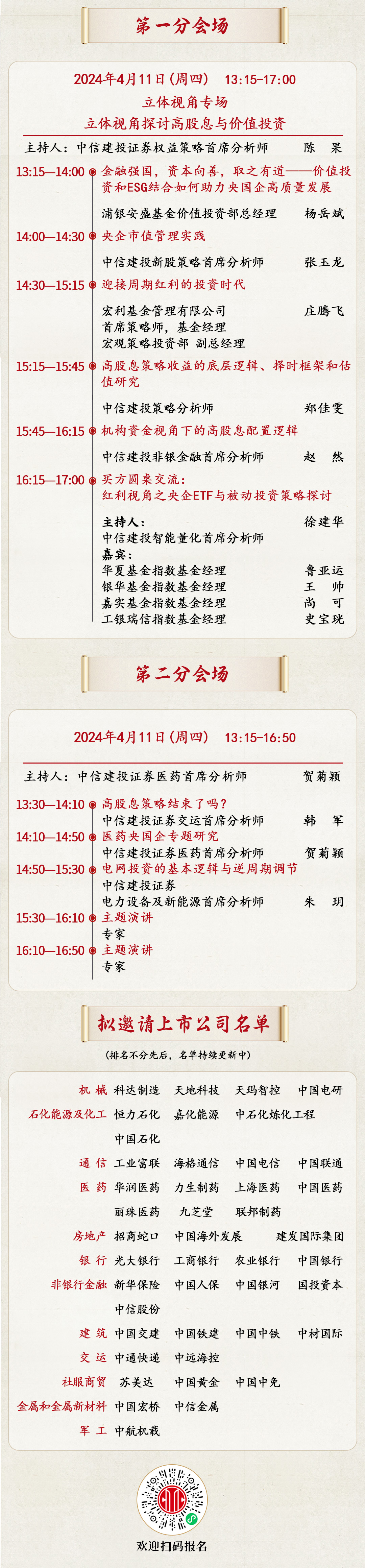 本次策略会设置1个主会场+2个分会场,我们邀请重点优质的50余家龙头上市公司和“链长”,共聚一堂,深度解读高股息与市值管理投资逻辑,拥抱投资机会。