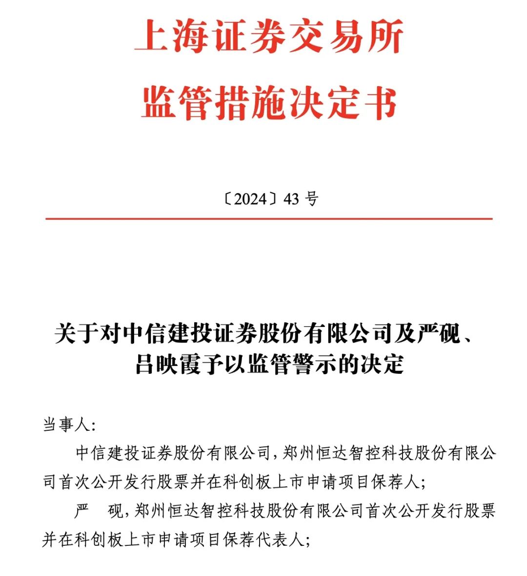 有网友认为,此次事件或将引发外界对中信建投证券从实习生到公司保代各个层面人员,合规意识是否充足的疑虑。因为就在7月24日,监管警示“钉子户”中信建投证券再收罚单。上交所发现,中信建投证券作为恒达智控项目的保荐人,严砚、吕映霞作为恒达智控项目的保荐代表人,存在保荐职责履行不到位情形。上交所表示,保荐人未能对发行人研发费用予以充分核查,函证程序执行不到位,导致相关披露不准确,履行保荐职责不到位,保荐代表人对此负有主要责任。