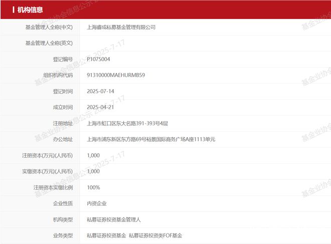 基金业协会的公示信息显示,上海睿成成立于2025年4月21日,并于7月14日完成登记。公司注册资本为1000万元,注册地在上海市虹口区。