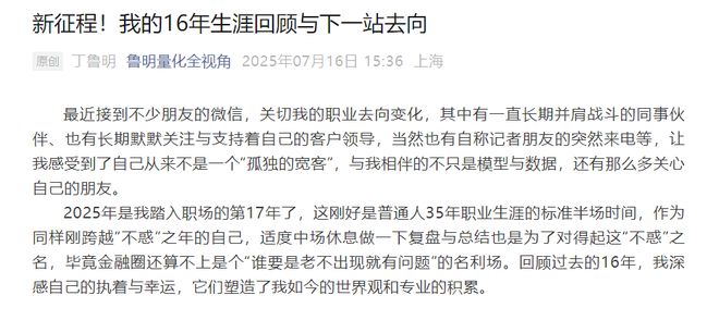 7月16日,中信建投金工首席分析师丁鲁明在个人微信公众号《鲁明量化全视角》中宣布将告别16年的卖方分析师一职,正式转投私募行业。这也意味着这位中信建投证券的10年“研究老将”正式官宣离职。