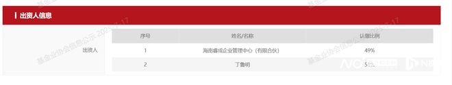 从上海睿成的出资人来看,丁鲁明是大股东,持有51%的股权;二股东是海南睿成企业管理中心(有限合伙),持股比例为49%。