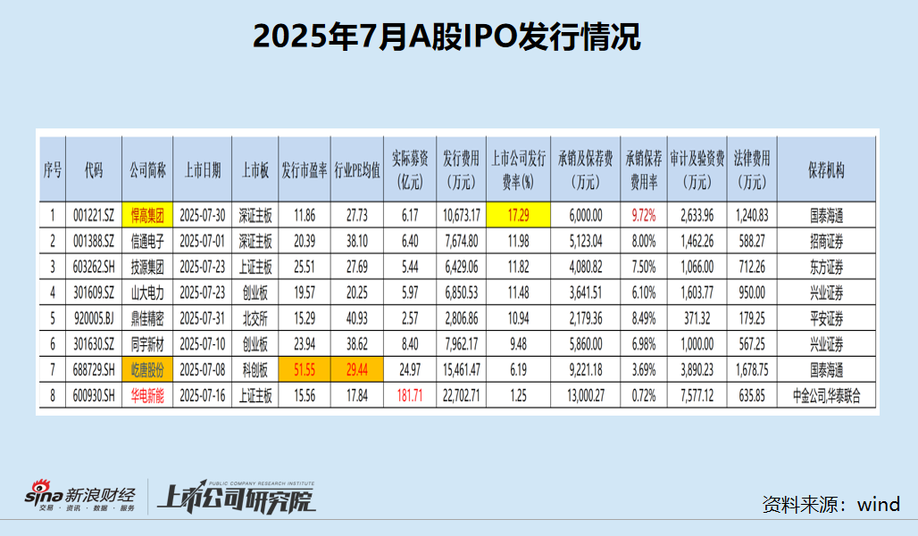 事实上,7月份和6月份都只有8家企业上市,7月份募资额暴增主要是因为一家“巨无霸”公司IPO,华电新能上市募资181.71亿元,创年内新高。