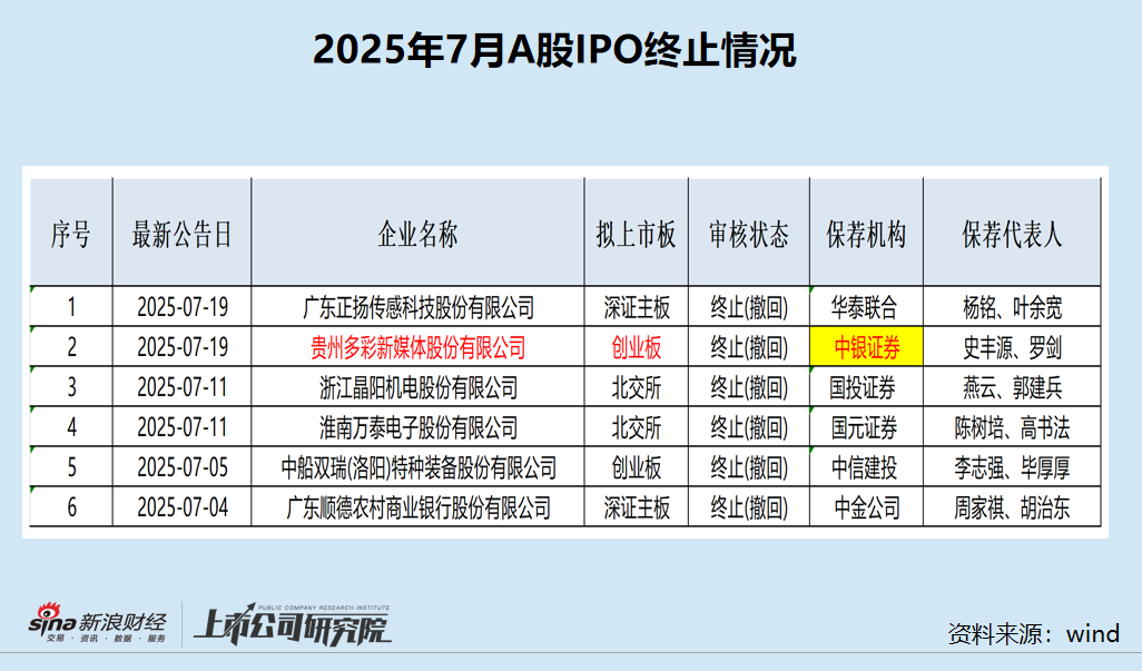 7月份6家终止IPO的企业分别是:贵州多彩新媒体股份有限公司(多彩新媒)、广东正扬传感科技股份有限公司、浙江晶阳机电股份有限公司、淮南万泰电子股份有限公司、中船双瑞(洛阳)特种装备股份有限公司(双瑞股份)、广东顺德农村商业银行股份有限公司。其中,中银证券保荐的多彩新媒、中信建投保荐的双瑞股份是在过会后终止IPO进程。