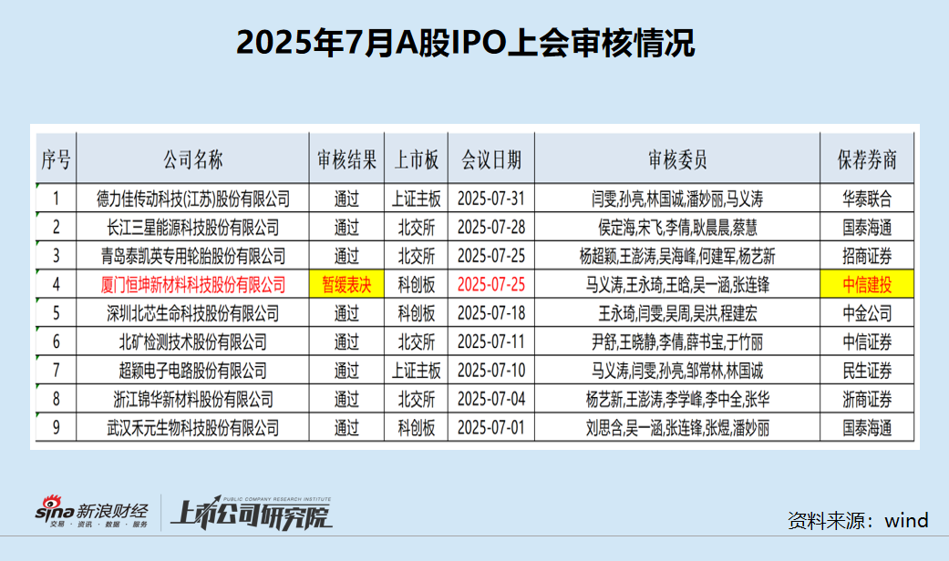 被暂缓审议的企业是厦门恒坤新材料科技股份有限公司(简称“恒坤新材”),中信建投保荐。在2025年7月25日的上市委审核会议上,恒坤新材被暂缓审议。在此之前,2025年以来共有19家券商保荐35家IPO企业上会且全部过会,过会率100%。