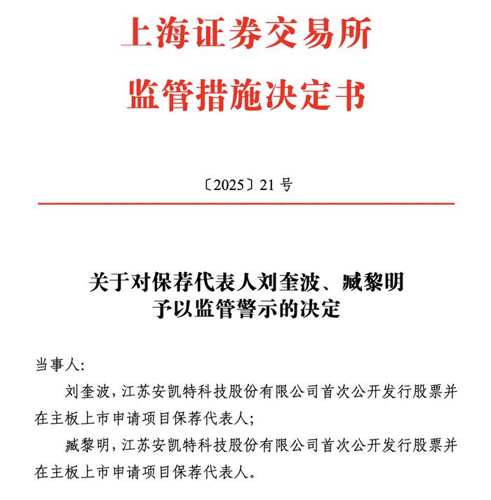从具体项目来看,上交所2025年4月3日对刘奎波、臧黎明出具监管警示,原因在于:在安凯特IPO项目中,对废料销售相关内部控制的尽调不充分,未督促充分整改与准确披露;对收入跨期、研发费用归集不准确、存货分类不准确等会计处理规范性核查把关不足,导致财务披露不准确,从而认定为履行保荐职责不到位。