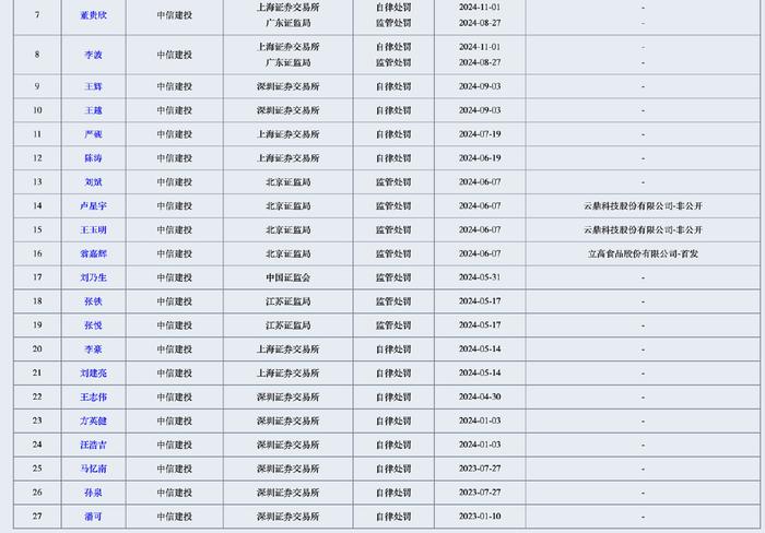 近日,中证协保荐代表人分类名单C(处罚处分类)再次更新,目前人数已达到309人,从执业机构来看,中信建投(601066)高达27人,加上D类(暂停业务类)中的2人,合计29人进入名单,超过中信证券(600030,23人)、中金公司,601995,14人)等头部券商,排名第一。