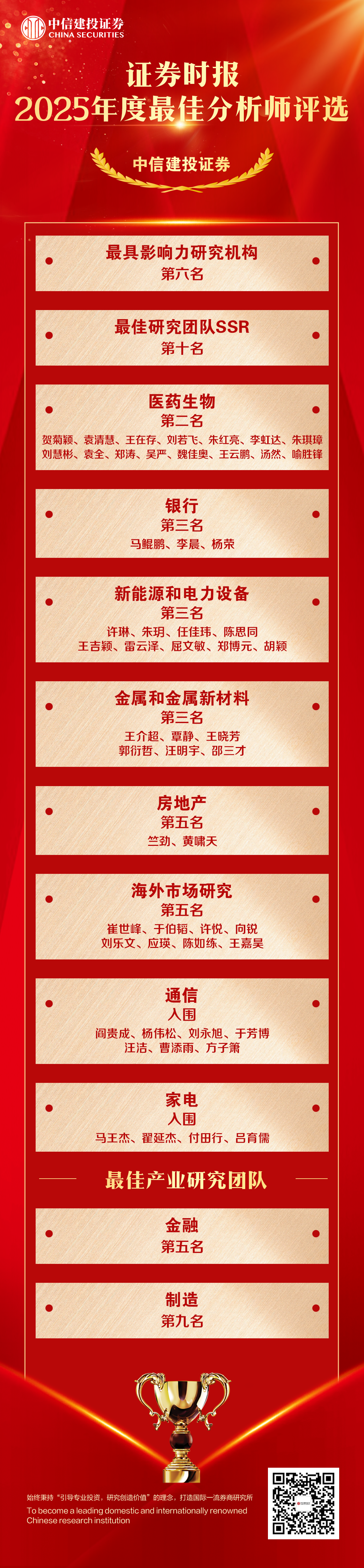 医药生物、银行、新能源和电力设备、金属和金属新材料、房地产及海外市场研究等研究团队荣获“2025证券时报最佳分析师”奖项。多个行业入围“最佳分析师”奖项。