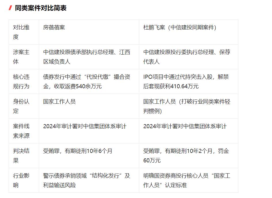 值得注意的是,房蓓蓓被司法机关认定为国家工作人员,这一定性与此前中信建投原投行委执行总经理杜鹏飞突击入股案一致,均适用受贿罪量刑标准,体现对国有金融机构人员职务犯罪的从严监管。2024年10月,房蓓蓓与中信建投另外两名核心业务人员先后被采取留置措施,案件经审查起诉后进入审判程序。