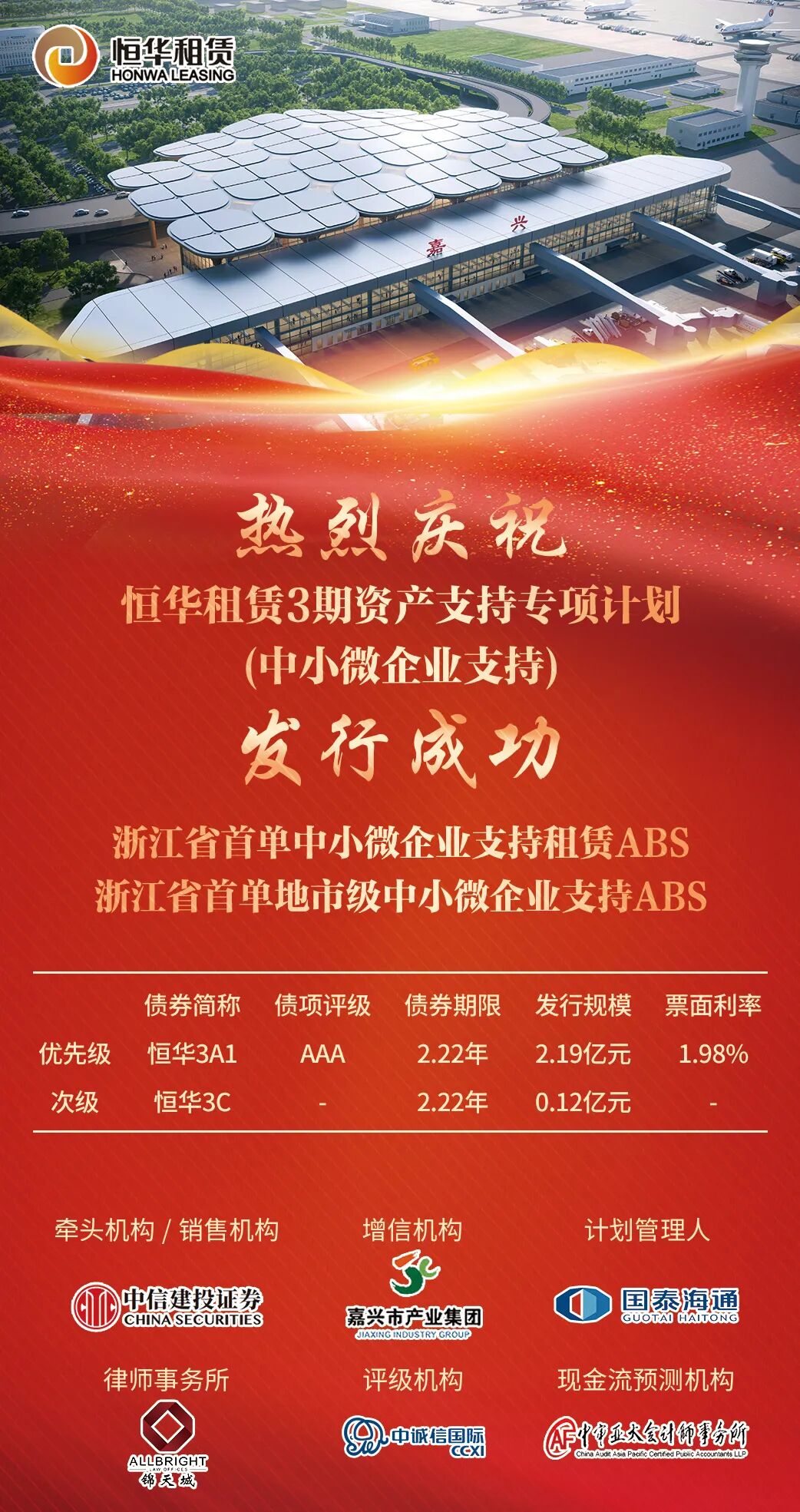 近日,由中信建投证券担任牵头机构及独家销售机构的“恒华租赁3期资产支持专项计划(中小微企业支持)”在上海证券交易所成功发行。本期项目发行规模2.31亿元,优先级票面利率1.98%,获得市场投资者踊跃认购,充分彰显了资本市场对中信建投证券专业能力及项目优质信用的认可。