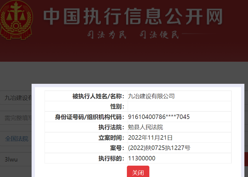 案号为(2022)陕0725执1227号的记录显示,该案件执行法院为勉县人民法院,被执行人名称为九冶建设有限公司,立案时间为2022年11月21日,执行标的为1130万元。执行信息公开网还显示,2022年9月份,九冶建设已经有一条被执行人记录。