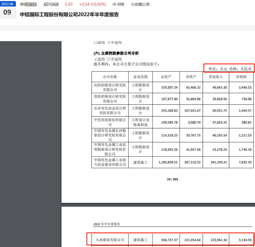 据中铝国际2022年半年报,中铝国际持有九冶建设73.17%的股权,截至2022年6月,九冶建设总资产93.67亿元,净资产22.15亿元。2022年上半年,九冶建设营业收入22.4亿元,净利润3134.59万元。
