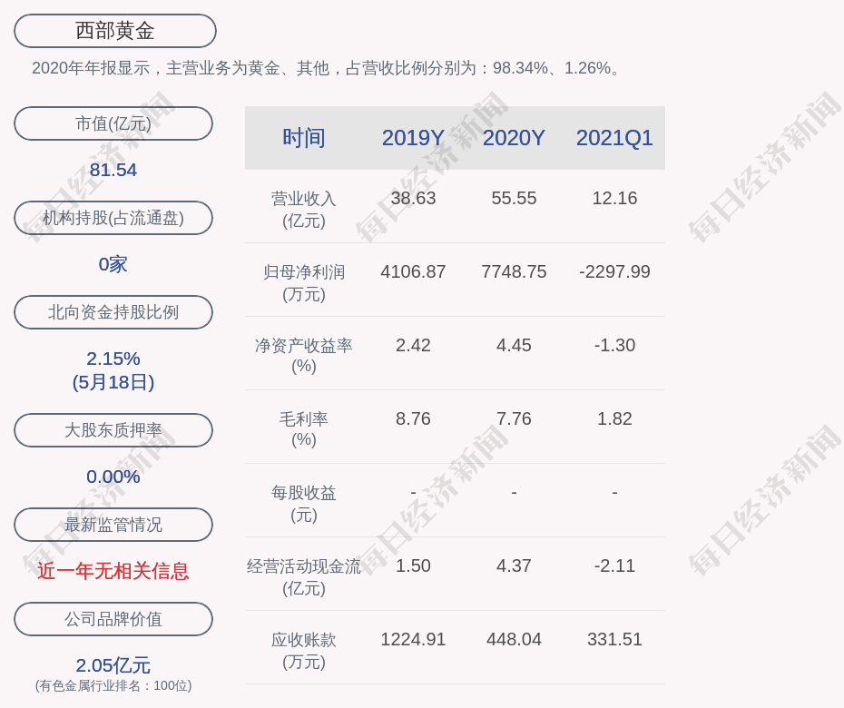 2020年年报显示,西部黄金的主营业务为黄金、其他,占营收比例分别为:98.34%、1.26%。