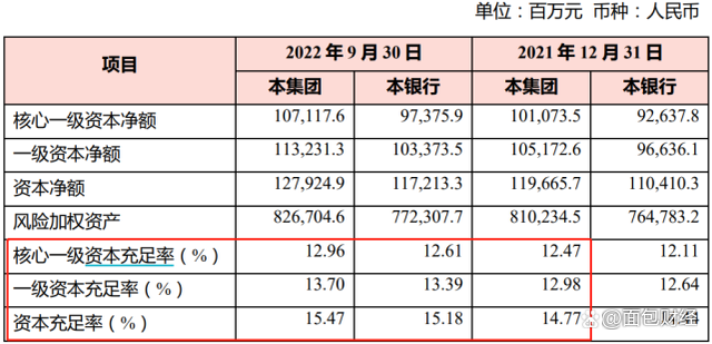截至三季度末,该行核心一级资本充足率12.96%,较上年末上升0.49个百分点;一级资本充足率13.70%,较上年末上升0.72个百分点;资本充足率 15.47%,较上年末上升0.70个百分点。