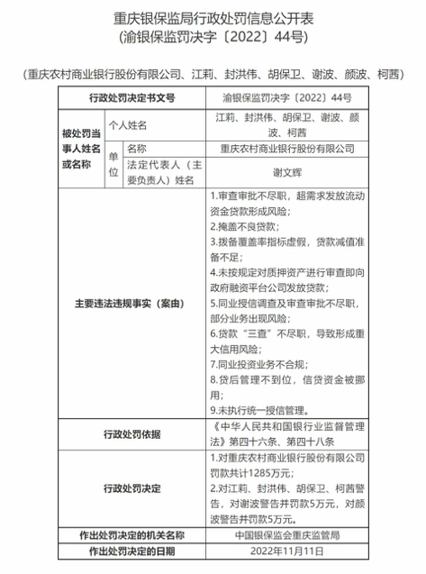 据11月21日银保监会官网发布的信息,11月11日,银保监会重庆监管局决定对渝农商行罚款共计1285万元。