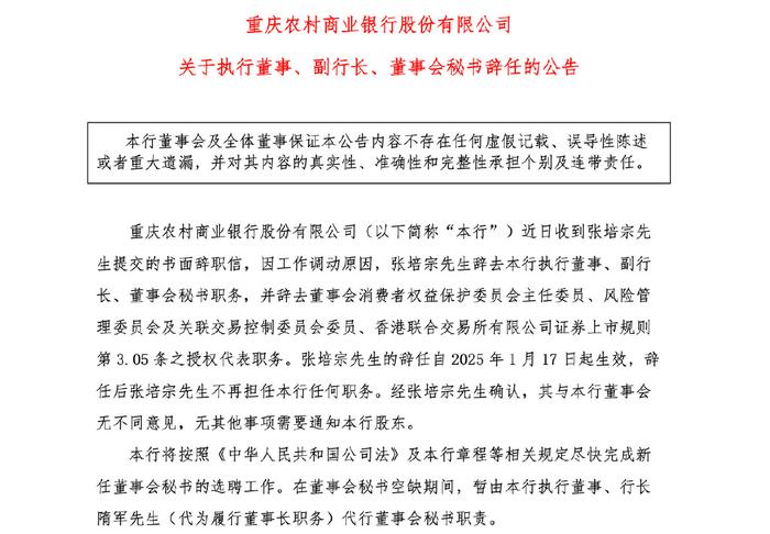 近日,渝农商行(601077.SH)公告称,因工作调动原因,张培宗辞去本行执行董事、副行长、董秘等职。辞职后,张培宗不再担任渝农商行任何职务,董秘职责暂由行长隋军代理。