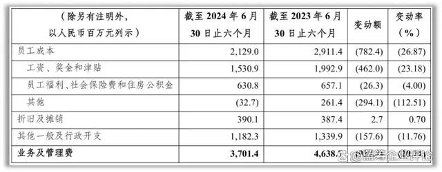 但从去年的半年报中,可以推测出一二。其中,业务及管理费用从46.39亿元下降至37.01亿元,同比减少9.37亿元;员工成本作为大头,从29.11亿元下降至21.29亿元,同比减少7.82亿元。