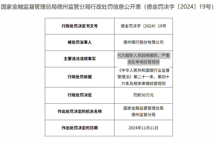 要知道,在去年11月份,山东的德州银行因为存在代为履职人员超期履职的违规现象,严重违反了审慎经营规则,被处以50万元罚款处罚。