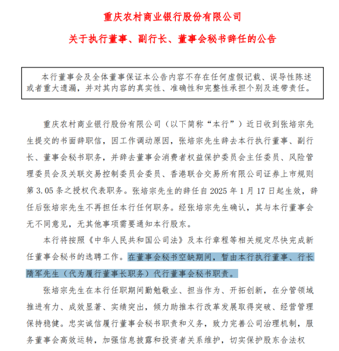 该公告还同时表示,在董事会秘书空缺期间,暂由本行执行董事、行长隋军先生代行董事会秘书职责。