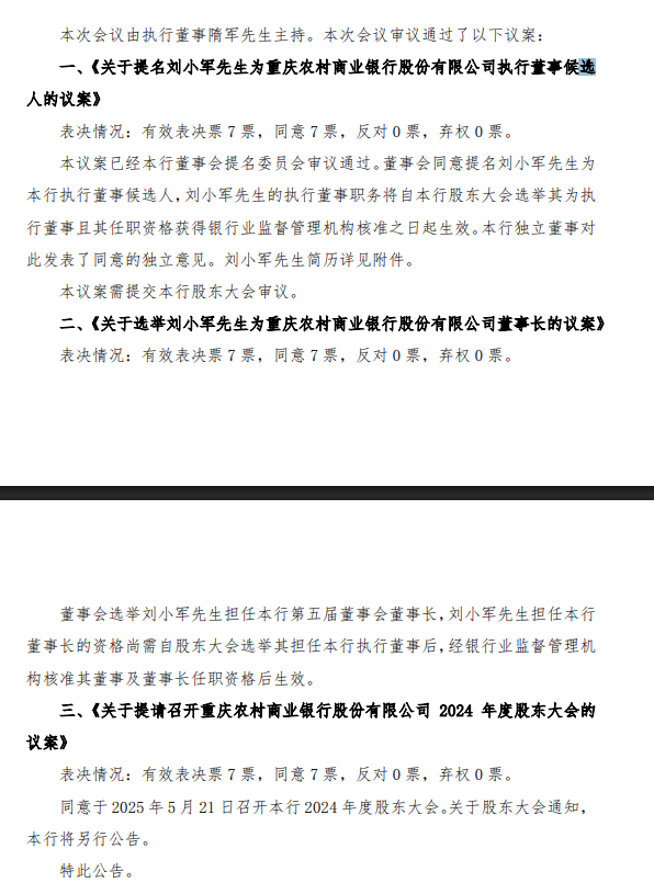 虽然在今年4月16日,渝农商行公告称,董事会提名刘小军为该行执行董事人选,并选举刘小军为渝农商行董事长,但刘小军的任职尚需股东大会选举通过其为执行董事后,再经监管部门核准其执行董事、董事长任职后才能上任,因此还未正式任职。
